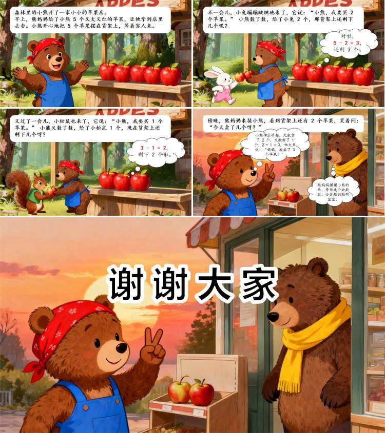 早上,熊妈妈给了小熊5个又大又红的苹果,让他拿到店里去卖。小熊开心地把5个苹果摆在货架上,等着客人来。