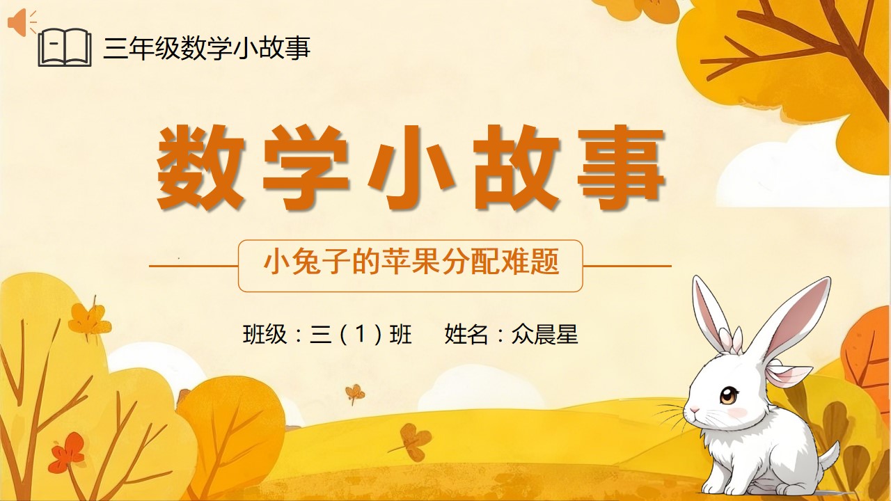 大家好,我是三年级一班的众晨星,今天我要给大家分享一个数学小故事,是《小兔子的苹果分配难题》。这个故事不仅有趣,还能教会我们一些重要的道理。