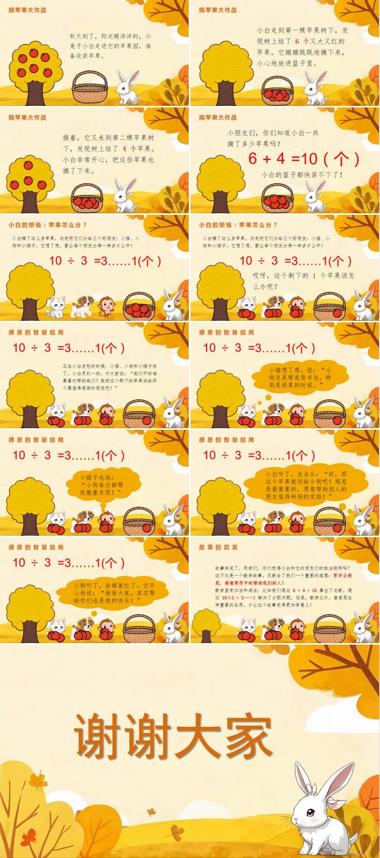 于是,小白开始用小爪子数了起来:“10÷3 = 3,还剩下 1 个苹果。”