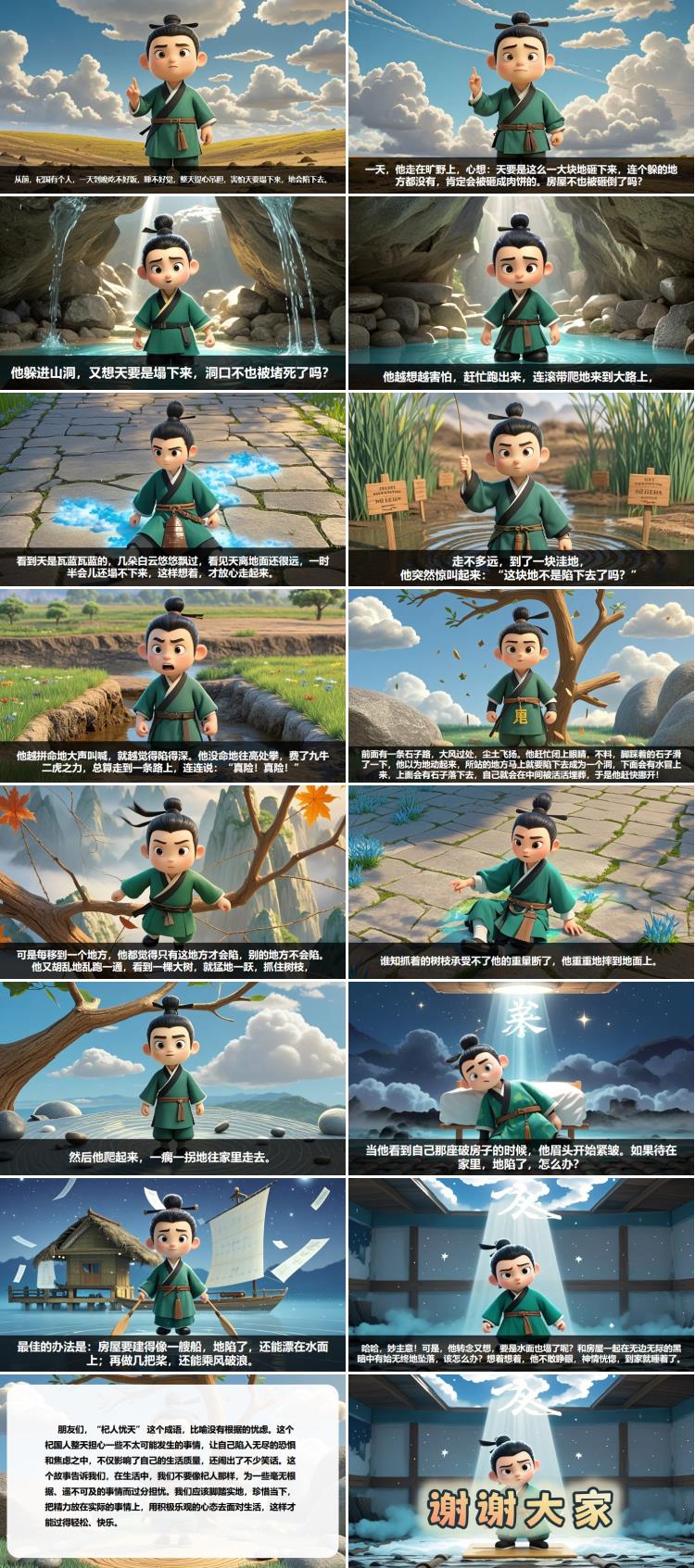 朋友们,“杞人忧天” 这个成语,比喻没有根据的忧虑。这个杞国人整天担心一些不太可能发生的事情,让自己陷入无尽的恐惧和焦虑之中,不仅影响了自己的生活质量,还闹出了不少笑话。这个故事告诉我们,在生活中,我们不要像杞人那样,为一些毫无根据、遥不可及的事情而过分担忧。我们应该脚踏实地,珍惜当下,把精力放在实际的事情上,用积极乐观的心态去面对生活,这样才能过得轻松、快乐。