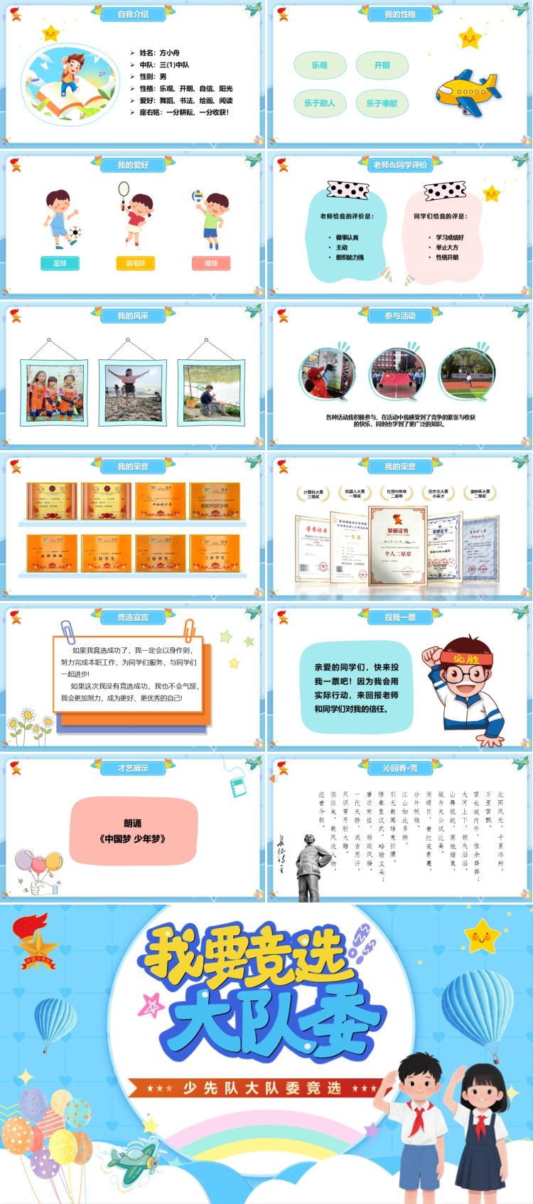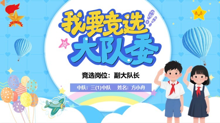 大家好!我是三(1)中队的方小舟,很荣幸能参加大队委竟选,这是一个锻炼自我、挑战自我的好机会,我一定会好好珍惜。
