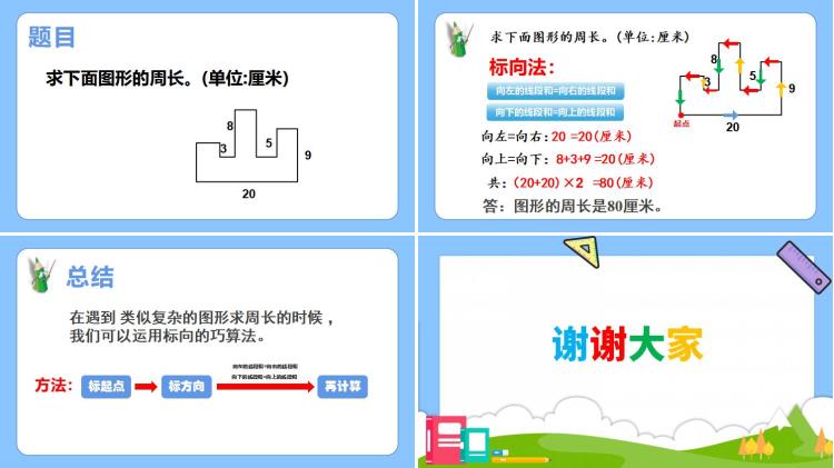 总结一下,在遇到类似的复杂不规则图形求周长时,我们可以运用标向法:先确定起点,再给每条边标注方向,最后根据 “向左的线段和 = 向右的线段和,向上的线段和 = 向下的线段和” 的规律来计算,这样就能轻松算出周长啦。
