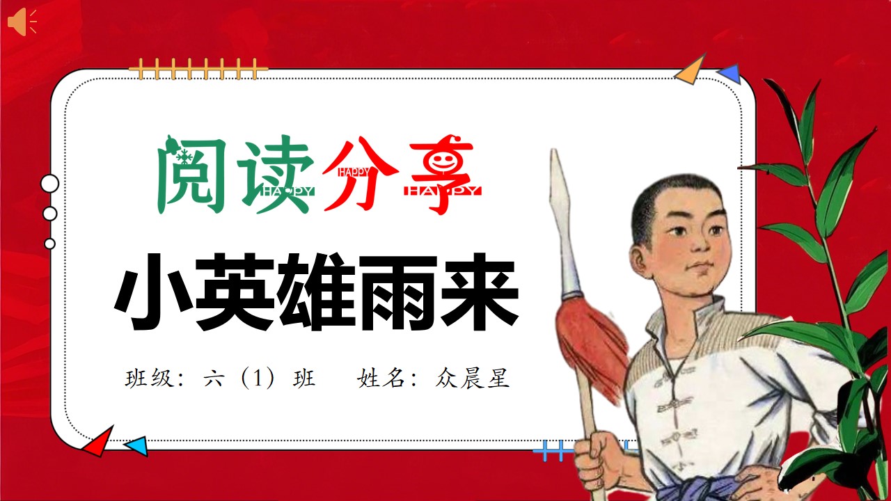 大家好!我是六年级一班的众晨星,今天我要和大家分享的好书是 ——《小英雄雨来》。这本书的作者是管桦。当我第一次翻开这本书时,就被那个叫雨来的小男孩深深吸引了。他和我们差不多大,却用勇敢和智慧谱写了一段抗日小英雄的传奇故事。