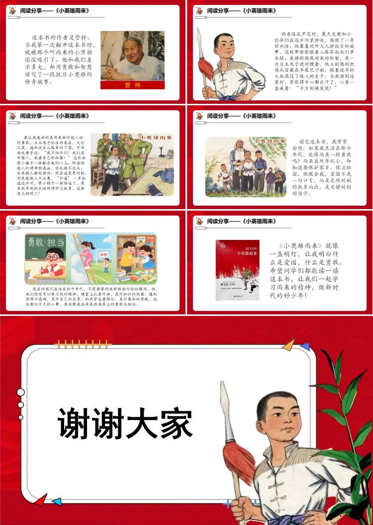 《小英雄雨来》就像一盏明灯,让我明白什么是爱国,什么是勇敢。希望同学们都能读一读这本书,让我们一起学习雨来的精神,做新时代的好少年!