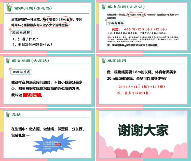 总结一下,在生活中,像做衣服、做跳绳、做蛋糕、分东西、包装礼盒等情况,当计算结果不是整数时,我们常常会用到去尾法,只保留商的整数部分,舍去小数部分。