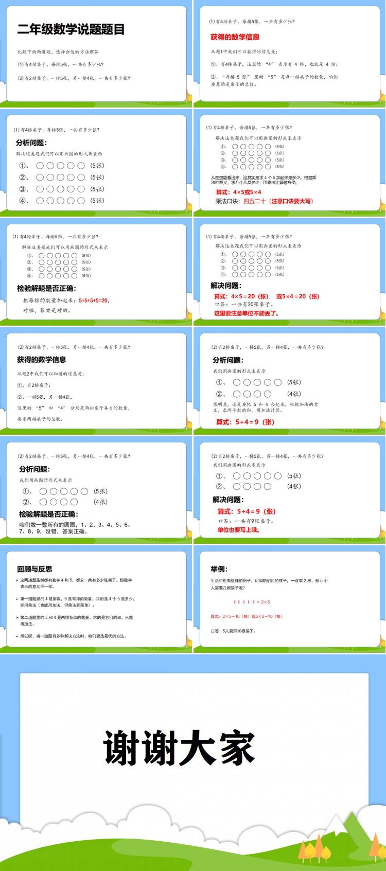 最后咱们来回顾一下。这两道题虽然都有数字 4 和 5,都求一共有多少张桌子,但数字表示的意义不一样。第一道题里的 4 是排数,5 是每排的数量,求的是 4 个 5 是多少,能用乘法(也能用加法,但乘法更简单);第二道题里的 5 和 4 是两排各自的数量,求的是它们的和,只能用加法。所以呀,当一道题有多种解决方法时,咱们要选最优的方法。