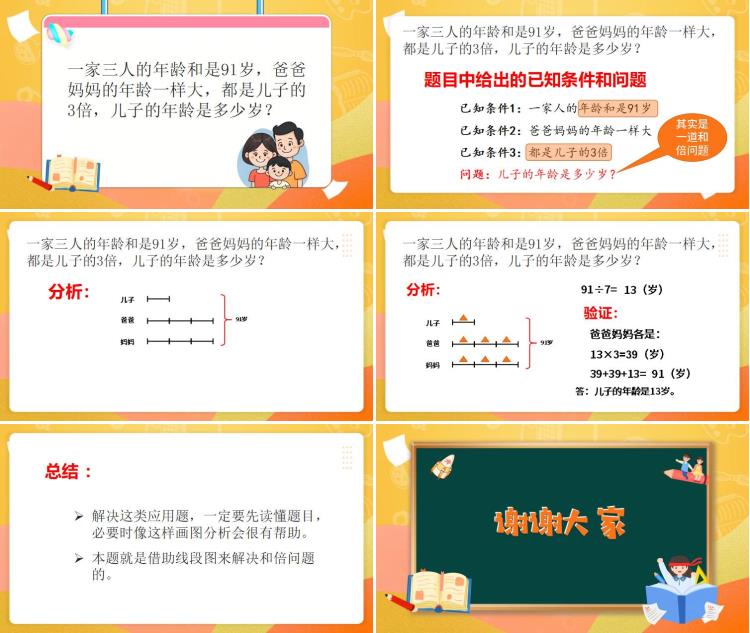 首先,我们来梳理一下题目中的已知条件。第一个已知条件是一家人的年龄和是 91 岁;第二个是爸爸妈妈的年龄一样大;第三个是爸爸妈妈的年龄都是儿子的 3 倍。而我们要解决的问题就是求出儿子的年龄。