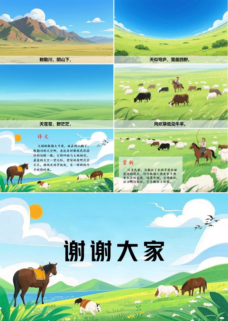 辽阔的敕勒大平原,就在阴山脚下。敕勒川的天空啊,看起来好像牧民们居住的毡帐一般。它的四面与大地相连,蔚蓝的天空一望无际,碧绿的原野茫茫不尽。那风吹到草低处,有一群群的牛羊时隐时现。