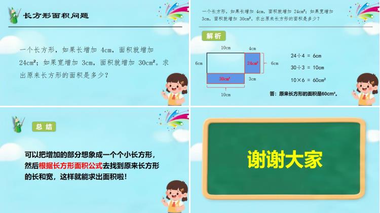 题目是这样的:一个长方形,如果长增加 4cm,面积就增加 24cm²;如果宽增加 3cm,面积就增加 30cm²。求出原来长方形的面积是多少?