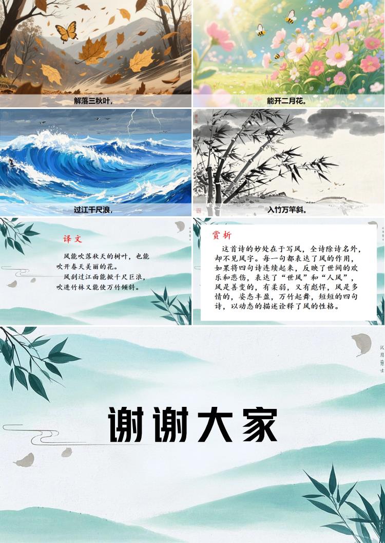 这首诗的妙处在于写风,全诗除诗名外,却不见风字。每一句都表达了风的作用,如果将四句诗连续起来,反映了世间的欢乐和悲伤,表达了“世风”和“人风”,风是善变的,有柔弱,又有彪悍,风是多情的,姿态丰盈,万竹起舞,短短的四句诗,以动态的描述诠释了风的性格。