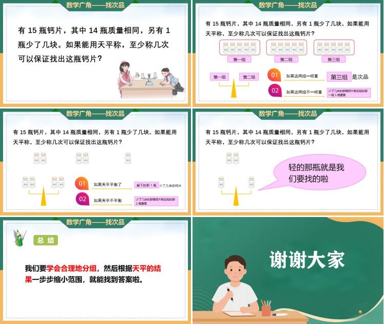 第一种情况,如果这两组一样重,那少了几块的那瓶钙片就在没称的那一组5瓶里面啦。