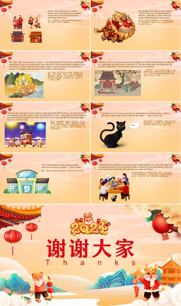 天天:I know. My grandpa use to tell me a story about Chinese New Year. He told me about a Monster, called Nian. It only comes out during Spring Festival to scare people.