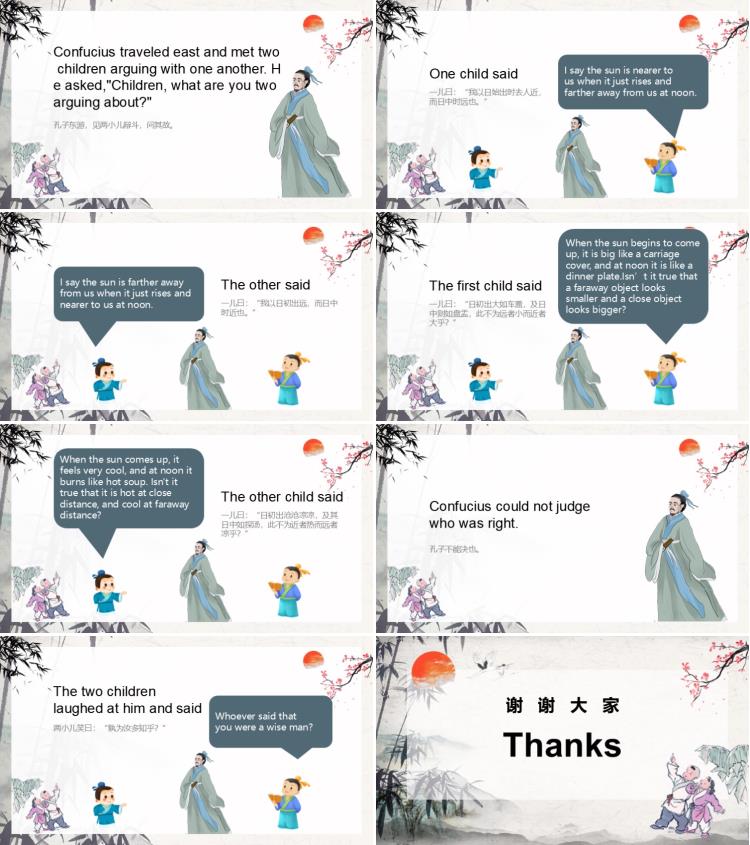 Confucius traveled east and met two children arguing with one another. He asked,"Children, what are you two arguing about?"孔子东游,见两小儿辩斗,问其故。