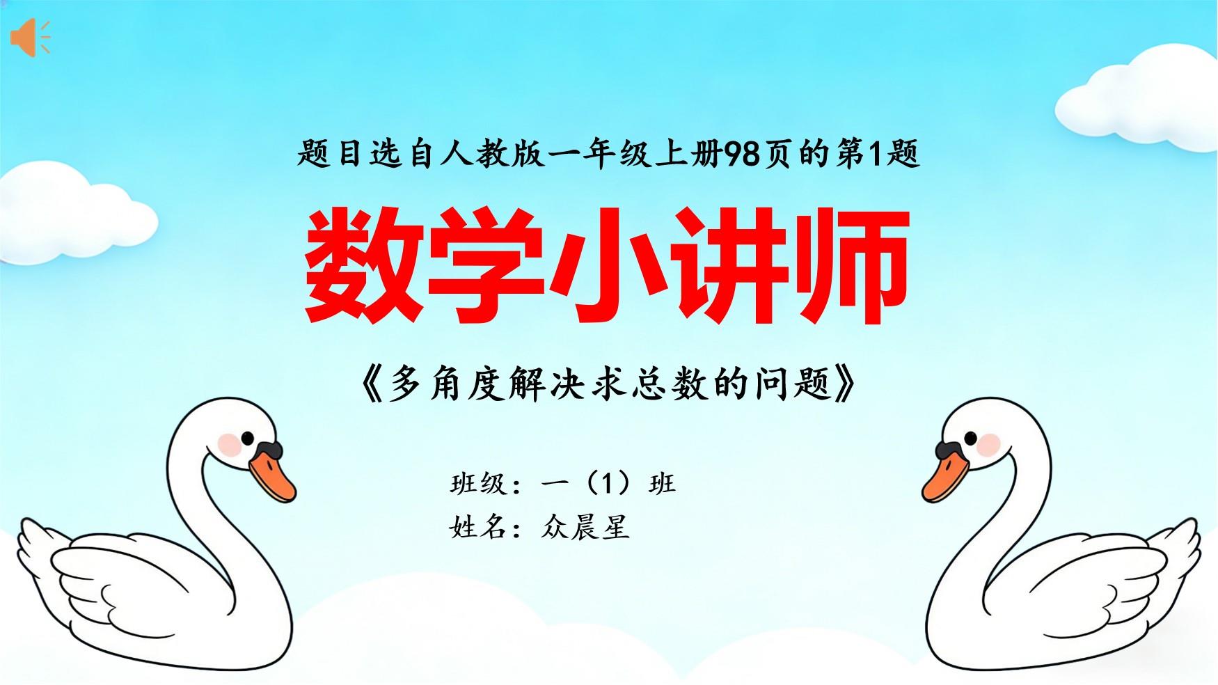 大家好!我是众晨星。今天,我和大家分享的题目是教材98页的第1题。题目给了一幅图,然后问水里有多少只天鹅?让我们列式。