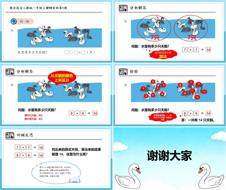 题目讲完了,现在让我们来检验一下吧!首先检查解题思路:“一共有多少只天鹅” 用加法计算,我们的解题思路正确。然后检查答案,我们可以用 “数一数、看一看” 的方法,避免错数、漏数,别忘记做好相应的记号哦!一、二、三、四、五、六、七、八、九、十、十一、十二、十三、十四,的确是 14 只天鹅。最后别忘记口答:答:一共有 14 只天鹅。