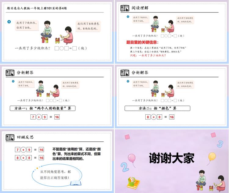 黄色积木有 8 块,红色积木有 8 块,把两种颜色的数量加起来,也能得到总数:8+8=16(块)