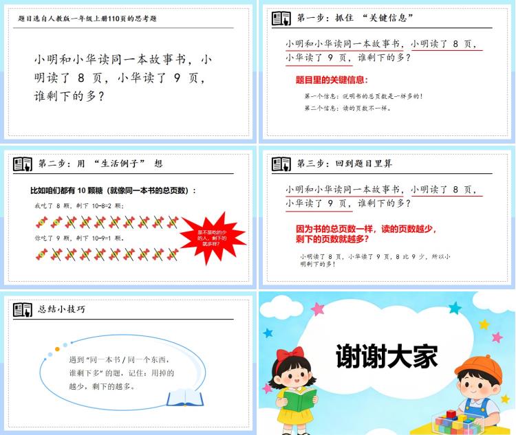 遇到 “同一本书 / 同一个东西,谁剩下多” 的题,记住:用掉的越少,剩下的越多。