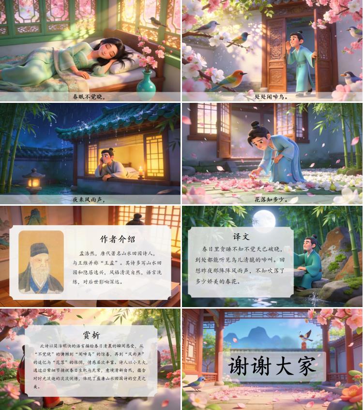 此诗以简洁明快的语言描绘春日清晨的瞬间感受,从“不觉晓”的慵懒到“闻啼鸟”的惊喜,再到“风雨声”的追忆与“花落”的怅惘,情感层次丰富。诗人以小见大,通过日常细节捕捉春日生机与无常,意境清新自然,蕴含对时光流逝的淡淡惋惜,体现了盛唐山水田园诗的空灵之美。