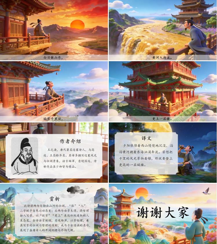此诗前两句勾勒出山河的壮阔,“依”“入”二字赋予自然以动态美;后两句由景生情,将哲理融入写景,以“欲穷”“更上”表达积极进取的人生态度。全诗语言凝练,意境雄浑,以景喻理,兼具写景的壮阔与哲理的深刻,成为千古传诵的名句,展现了盛唐诗人的开阔胸襟与昂扬气概。