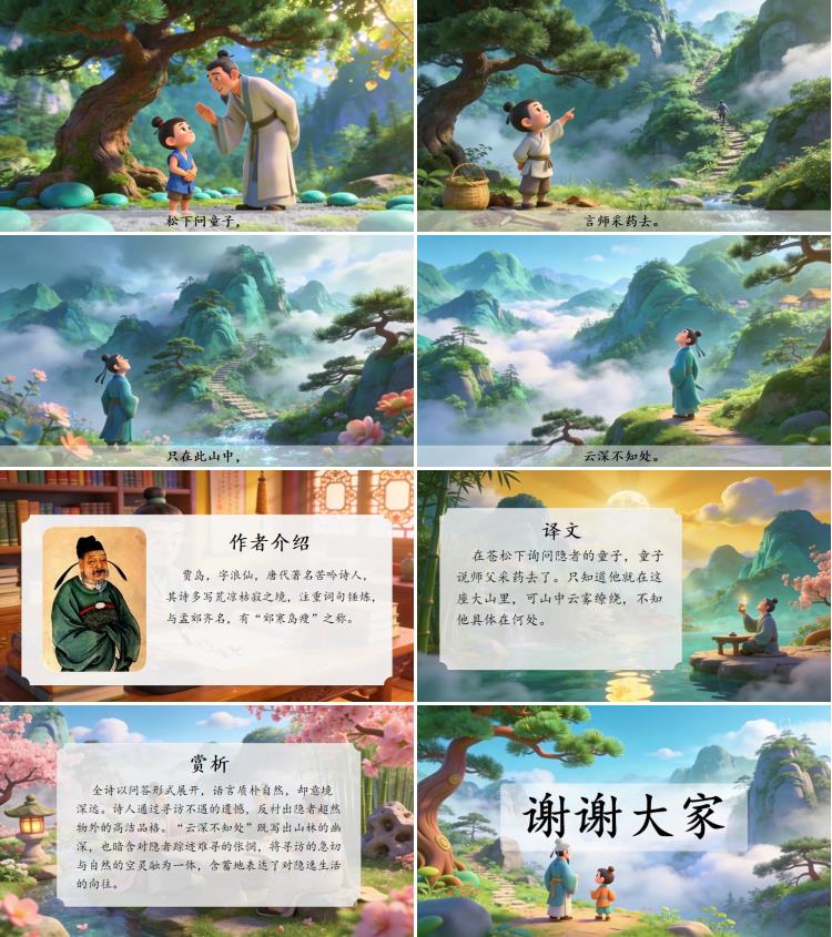 全诗以问答形式展开,语言质朴自然,却意境深远。诗人通过寻访不遇的遗憾,反衬出隐者超然物外的高洁品格。“云深不知处”既写出山林的幽深,也暗含对隐者踪迹难寻的怅惘,将寻访的急切与自然的空灵融为一体,含蓄地表达了对隐逸生活的向往。