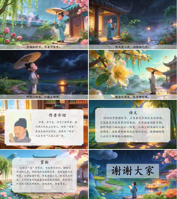此诗以“喜”字贯穿,首联赞雨知时,颔联写雨润物无声,颈联绘雨夜朦胧之景,尾联想象雨后繁花。全诗融情于景,将春雨拟人化,既写雨之形态,又抒对春雨的喜爱与对生机的期盼,体现诗人对自然与民生的关怀,意境清新,含蓄隽永。