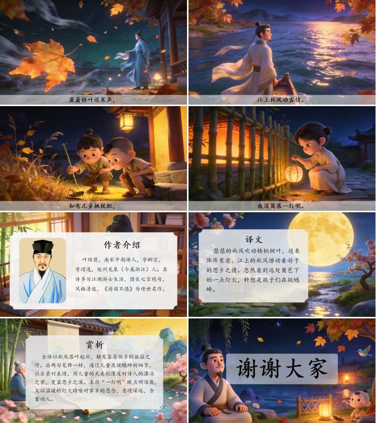 瑟瑟的秋风吹动梧桐树叶,送来阵阵寒意,江上的秋风撩动着游子的思乡之情。忽然看到远处篱笆下的一点灯火,料想是孩子们在捉蟋蟀。