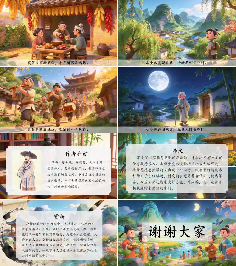 此诗以游村经历为线索,生动展现了农村的丰收景象与淳朴民风。颔联“山重水复疑无路,柳暗花明又一村”不仅写景逼真,更蕴含人生哲理,成为千古名句。全诗语言质朴自然,意境明快流畅,既表达了对田园生活的热爱,也流露出对乡村淳朴人情的向往,体现了诗人在逆境中乐观豁达的心境与对生活的热爱。