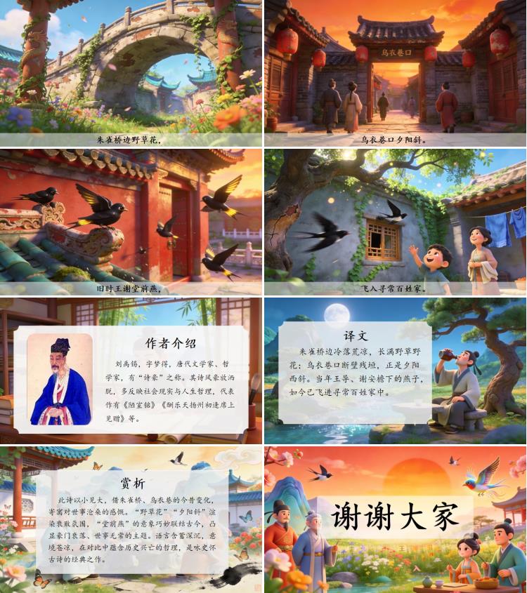 朱雀桥边冷落荒凉,长满野草野花;乌衣巷口断壁残垣,正是夕阳西斜。当年王导、谢安檐下的燕子,如今已飞进寻常百姓家中。