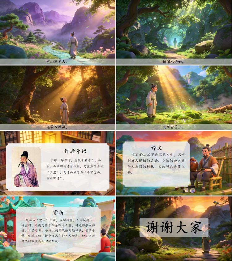 此诗以“空山”开篇,以动衬静,人语反衬山林空寂。后两句借夕阳余晖与青苔,将光影融入静谧,尽显空灵。全诗以极简笔触勾勒禅意,寓情于景,体现王维“诗中有画”的艺术特色,传达出对自然的敬畏与内心的恬淡。