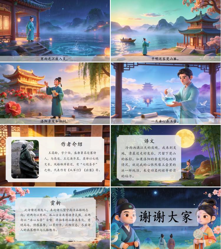 冷雨洒满江天的夜晚,我来到吴地,清晨送走好友后,只留下楚山的孤影。如果洛阳的亲友问起我的情况,就说我的心依然像玉壶里的冰一样纯洁,未受功名利禄等世情的玷污。