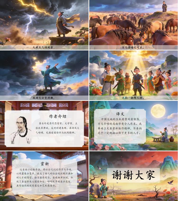 这首诗以比喻手法,将社会沉闷比作万马齐喑,以风雷象征变革,表达了诗人对社会现状的不满和对人才的渴望。语言激昂有力,意境雄浑壮阔,体现了龚自珍关心国家命运、呼吁改革的进步思想,具有强烈的现实意义和艺术感染力。