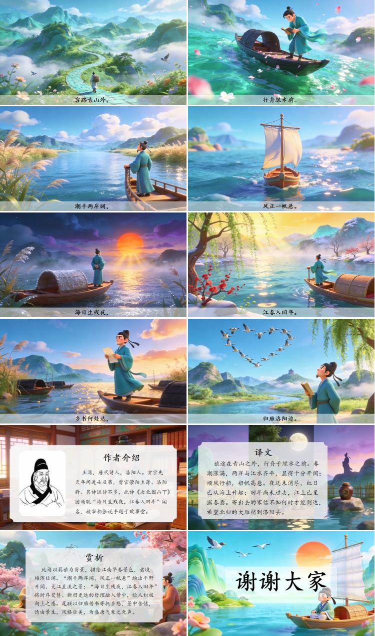 此诗以羁旅为背景,描绘江南早春景色,意境雄浑壮阔。“潮平两岸阔,风正一帆悬”绘出平野开阔、大江直流之景;“海日生残夜,江春入旧年”将时序交替、新旧更迭的哲理融入景中,给人积极向上之感。尾联以归雁传书寄托乡愁,景中含情,情由景生,风格壮美,为盛唐气象之先声。