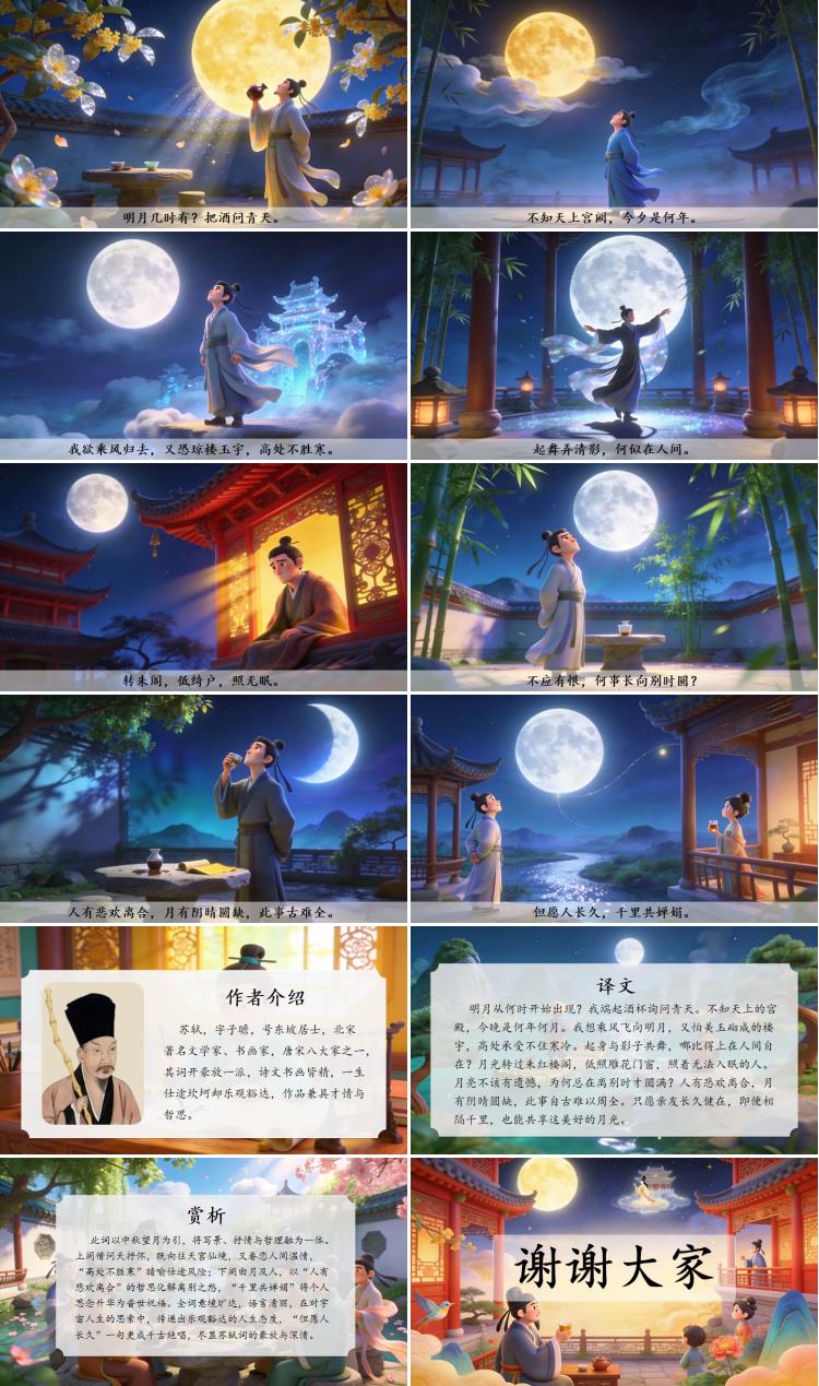 此词以中秋望月为引,将写景、抒情与哲理融为一体。上阕借问天抒怀,既向往天宫仙境,又眷恋人间温情,“高处不胜寒”暗喻仕途风险;下阕由月及人,以“人有悲欢离合”的哲思化解离别之愁,“千里共婵娟”将个人思念升华为普世祝福。全词意境旷达,语言清丽,在对宇宙人生的思索中,传递出乐观豁达的人生态度,“但愿人长#chang2#久”一句更成千古绝唱,尽显苏轼词的豪放与深情。