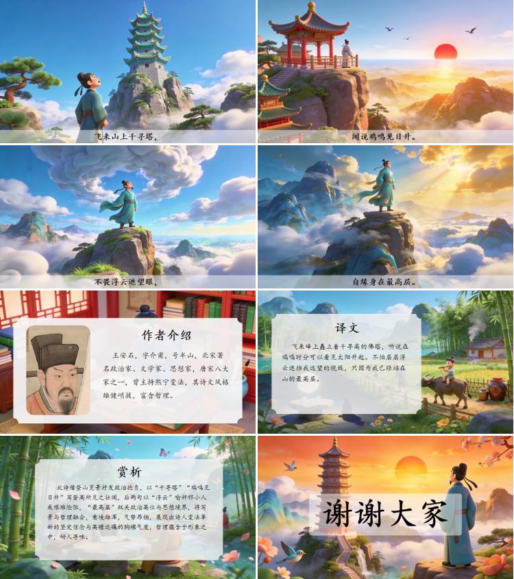 此诗借登山览景抒发政治抱负,以“千寻塔”“鸡鸣见日升”写登高所见之壮阔,后两句以“浮云”喻奸邪小人或艰难险阻,“最高层”双关政治高位与思想境界,将写景与哲理融合,意境雄浑,气势昂扬,展现出诗人变法革新的坚定信念与高瞻远瞩的胸襟气度,哲理蕴含于形象之中,耐人寻味。
