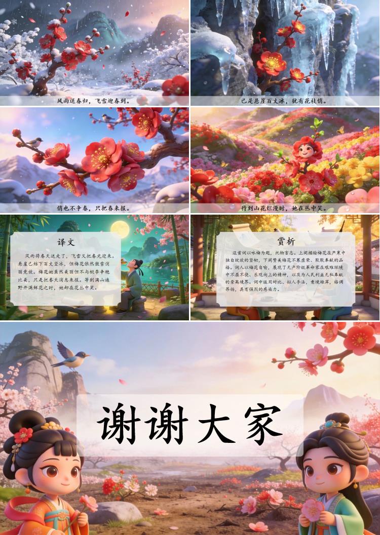 风雨将春天送走了,飞雪又把春光迎来。悬崖已结下百丈坚冰,但梅花依然傲雪俏丽竞放。梅花她虽然美丽但不与桃李争艳比美,只是把春天消息来报。等到满山遍野开满鲜花之时,她却在花丛中笑。