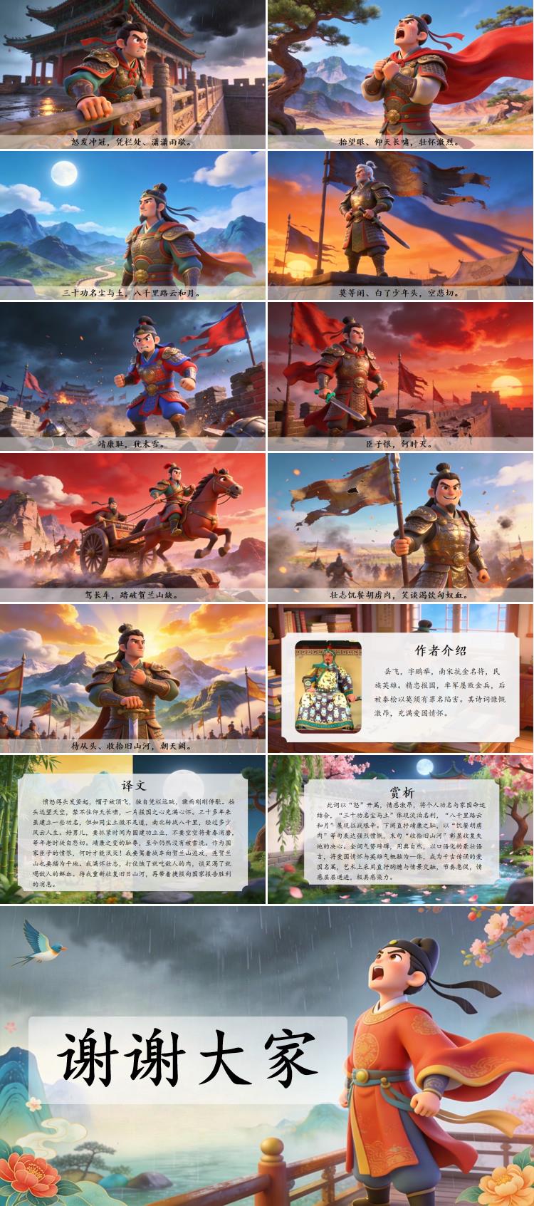 此词以“怒”开篇,情感激昂,将个人功名与家国命运结合,“三十功名尘与土”体现淡泊名利,“八千里路云和月”展现征战艰辛。下阕直抒靖康之耻,以“饥餐胡虏肉”等句表达强烈愤慨,末句“收拾旧山河”彰显收复失地的决心。全词气势磅礴,用典自然,以口语化的豪壮语言,将爱国情怀与英雄气概融为一体,成为千古传诵的爱国名篇,艺术上采用直抒胸臆与情景交融,节奏急促,情感层层递进,极具感染力。