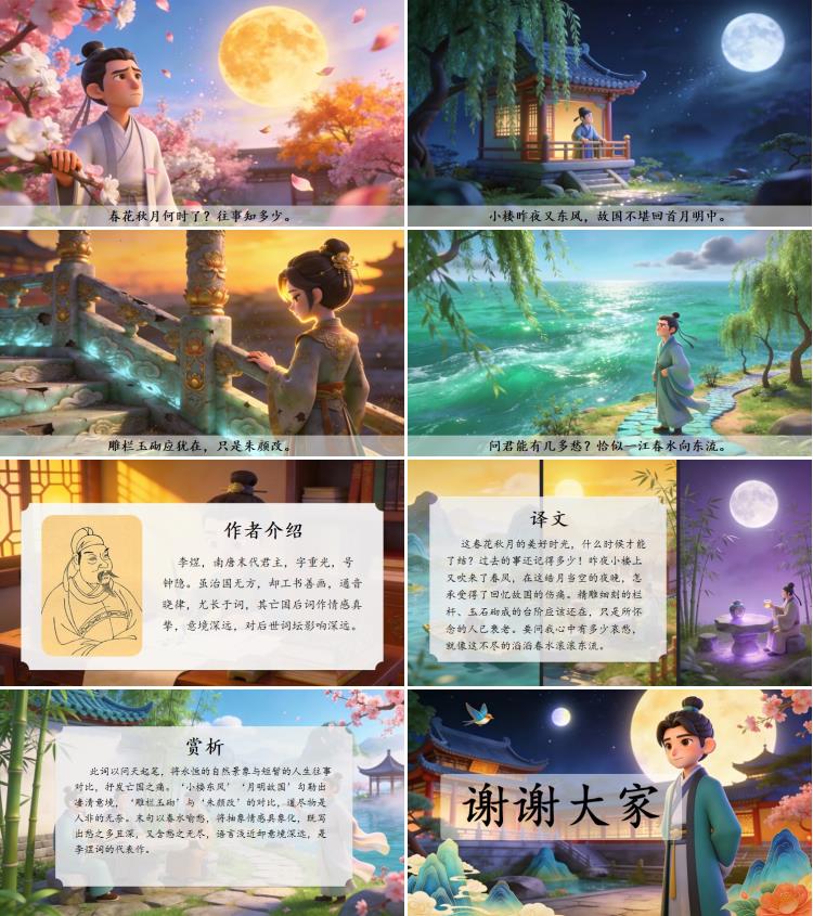 此词以问天起笔,将永恒的自然景象与短暂的人生往事对比,抒发亡国之痛。‘小楼东风’‘月明故国’勾勒出凄清意境,‘雕栏玉砌’与‘朱颜改’的对比,道尽物是人非的无奈。末句以春水喻愁,将抽象情感具象化,既写出愁之多且深,又含愁之无尽,语言浅近却意境深远,是李煜词的代表作。