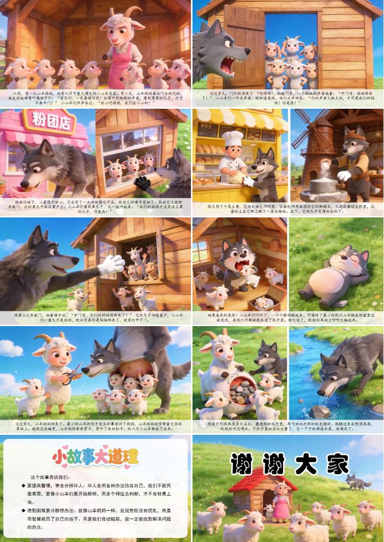 从前,有一位山羊妈妈,她有七只可爱又调皮的小山羊宝宝。有一天,山羊妈妈要出门去找吃的,临走前她特意叮嘱孩子们:“宝贝们,一定要提防狼!如果听到粗粗的声音,看到黑黑的爪子,千万不要开门!” 小山羊们齐声答应:“放心吧妈妈,我们会小心的!”