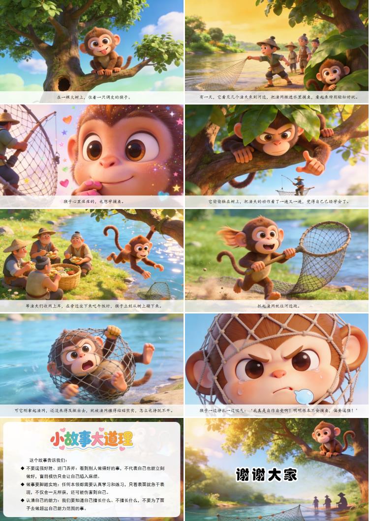 在一棵大树上,住着一只调皮的猴子。有一天,它看见几个渔夫来到河边,把渔网撒进水里捕鱼,看起来特别轻松好玩。