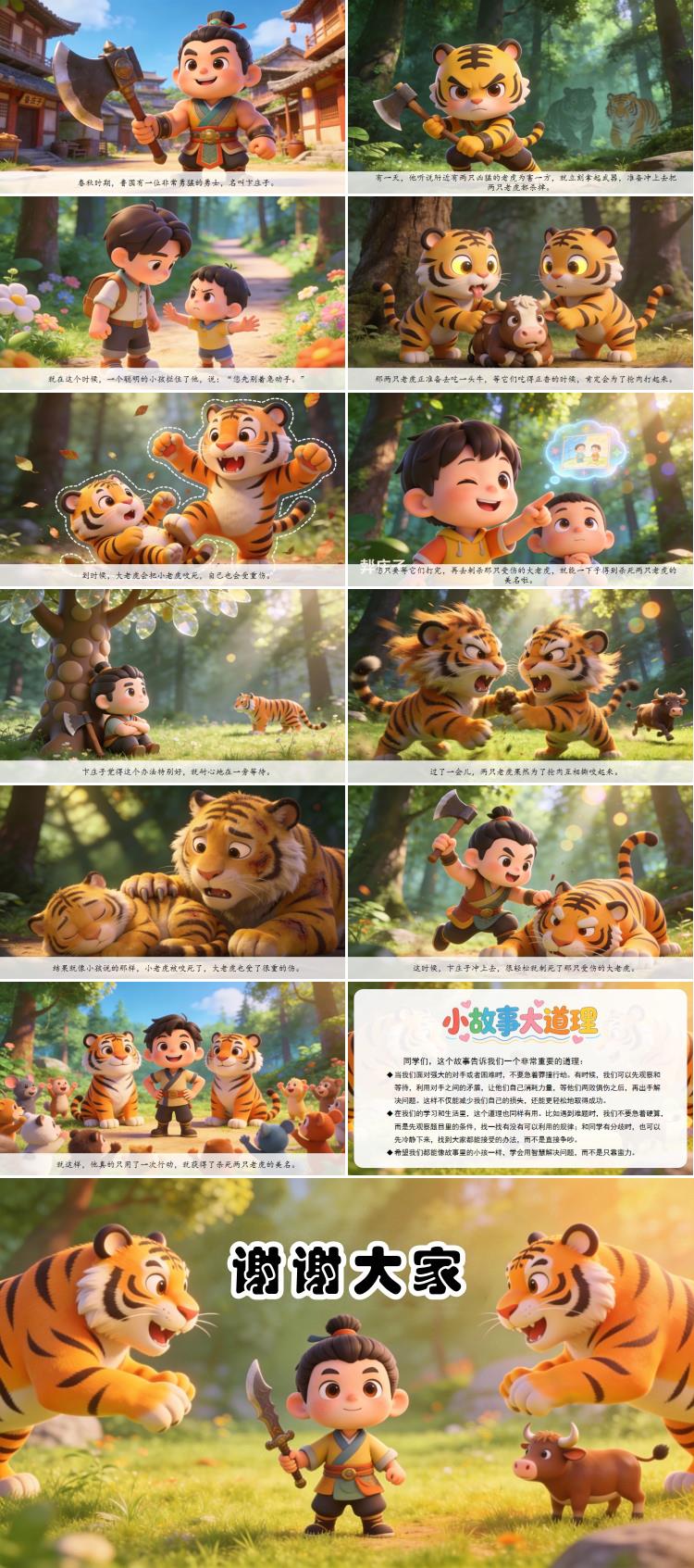 就在这个时候,一个聪明的小孩拦住了他,说:“您先别着急动手。那两只老虎正准备去吃一头牛,等它们吃得正香的时候,肯定会为了抢肉打起来。到时候,大老虎会把小老虎咬死,自己也会受重伤。您只要等它们打完,再去刺杀那只受伤的大老虎,就能一下子得到杀死两只老虎的美名啦。”