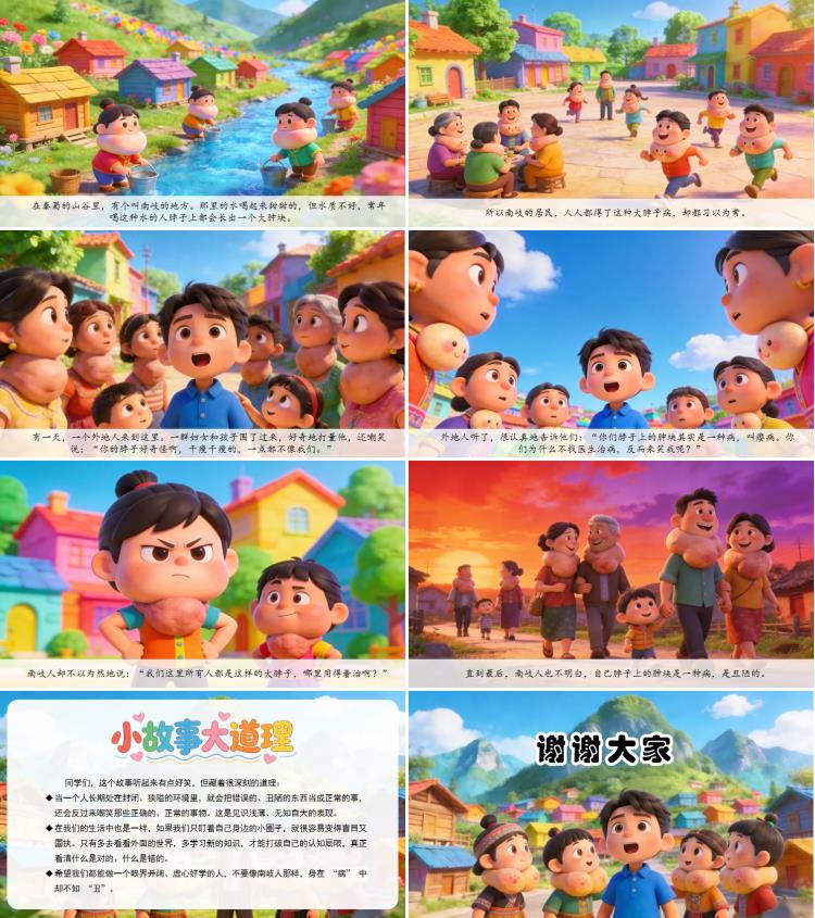 外地人听了,很认真地告诉他们:“你们脖子上的肿块其实是一种病,叫瘿病。你们为什么不找医生治病,反而来笑我呢?”