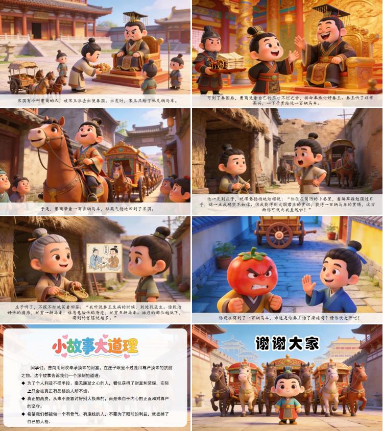 同学们,曹商用阿谀奉承换来的财富,在庄子眼里不过是用尊严换来的肮脏之物。这个故事告诉我们一个深刻的道理: