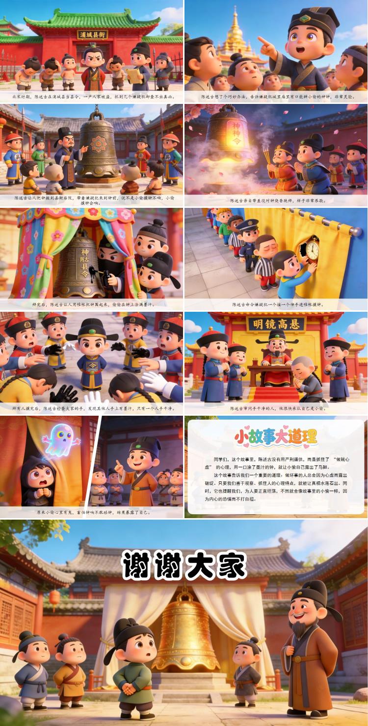 同学们,这个故事里,陈述古没有用严刑逼供,而是抓住了 “做贼心虚” 的心理,用一口涂了墨汁的钟,就让小偷自己露出了马脚。