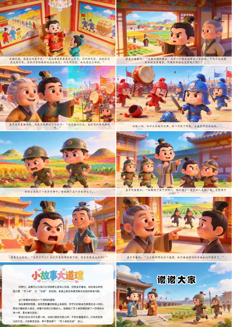 同学们,梁惠王以为自己比邻国君主更关心百姓,但在孟子看来,他的做法和邻国只是 “五十步” 与 “百步” 的区别,本质上都没有真正解决百姓的根本问题。