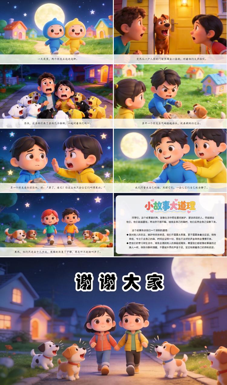 同学们,这个故事里的狗,就像生活中那些喜欢嫉妒、爱说闲话的人。你越理会他们,他们就越嚣张;而当你不理不睬,继续走自己的路时,他们反而会自己安静下来。