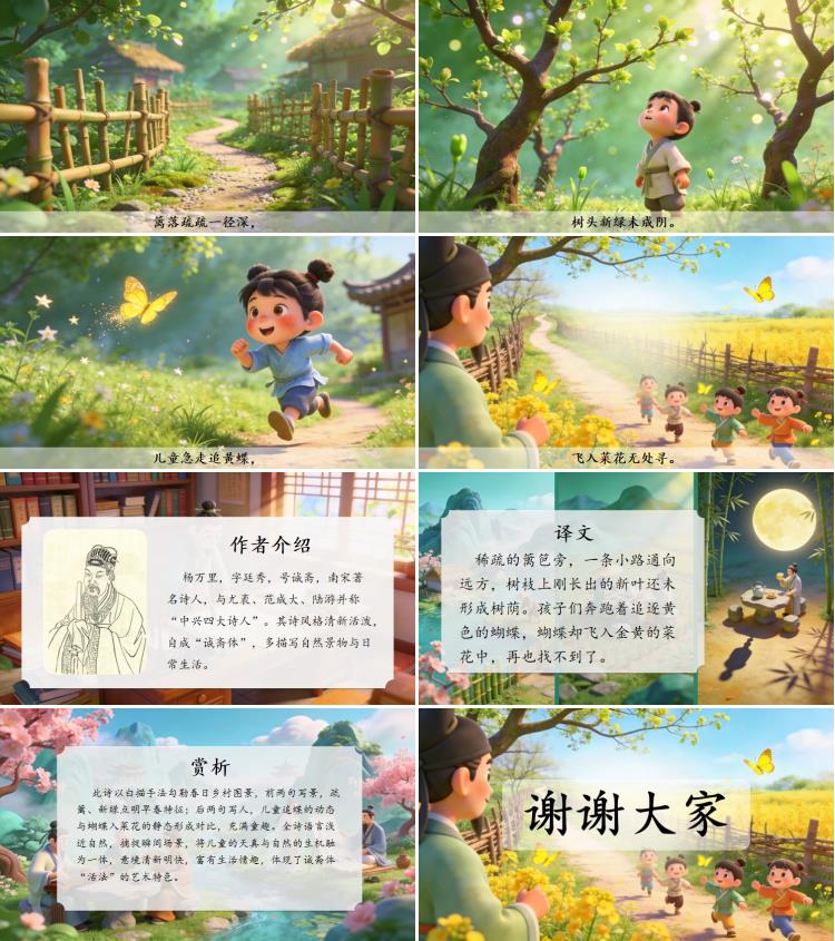 此诗以白描手法勾勒春日乡村图景,前两句写景,疏篱、新绿点明早春特征;后两句写人,儿童追蝶的动态与蝴蝶入菜花的静态形成对比,充满童趣。全诗语言浅近自然,捕捉瞬间场景,将儿童的天真与自然的生机融为一体,意境清新明快,富有生活情趣,体现了诚斋体“活法”的艺术特色。