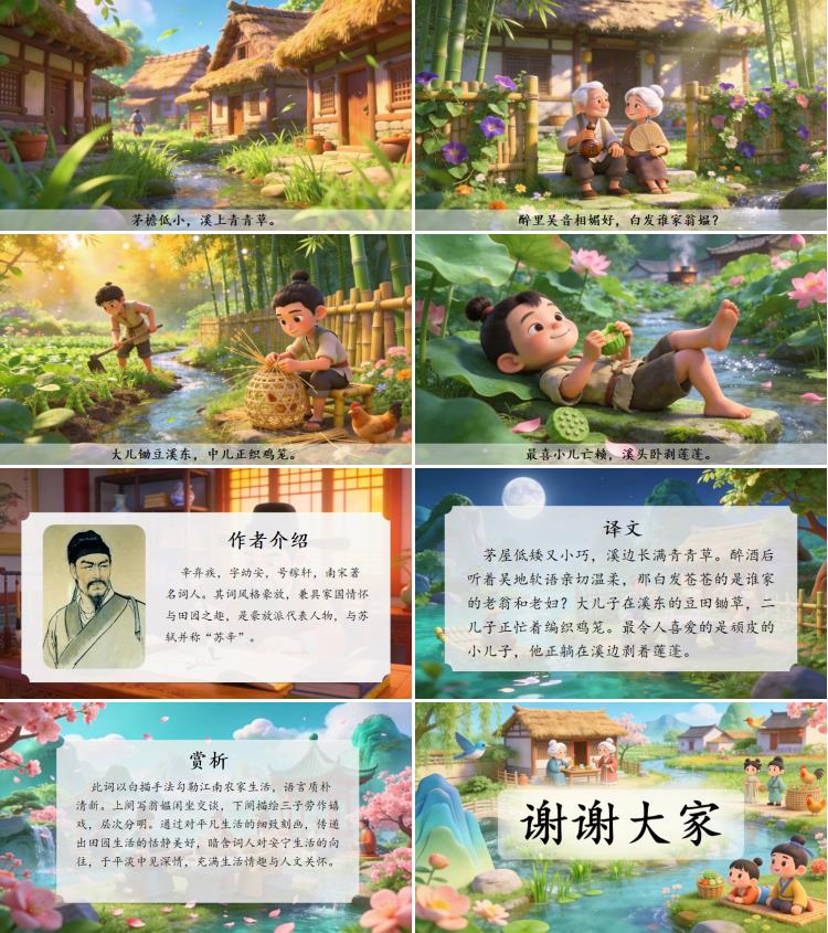 此词以白描手法勾勒江南农家生活,语言质朴清新。上阕写翁媪闲坐交谈,下阕描绘三子劳作嬉戏,层次分明。通过对平凡生活的细致刻画,传递出田园生活的恬静美好,暗含词人对安宁生活的向往,于平淡中见深情,充满生活情趣与人文关怀。