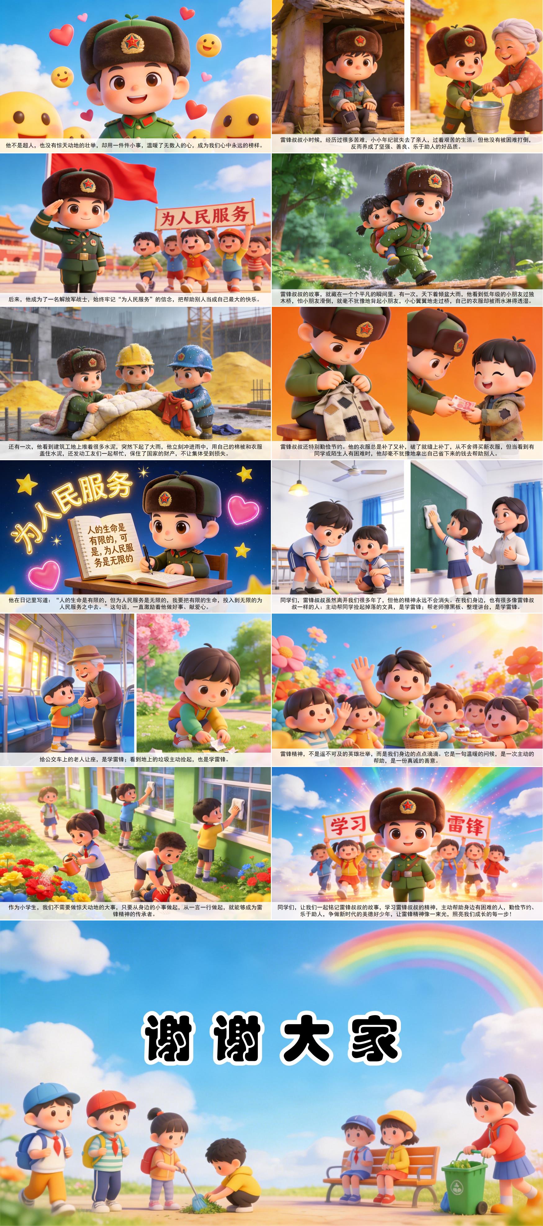同学们,让我们一起铭记雷锋叔叔的故事,学习雷锋叔叔的精神,主动帮助身边有困难的人,勤俭节约、乐于助人,争做新时代的美德好少年,让雷锋精神像一束光,照亮我们成长的每一步!