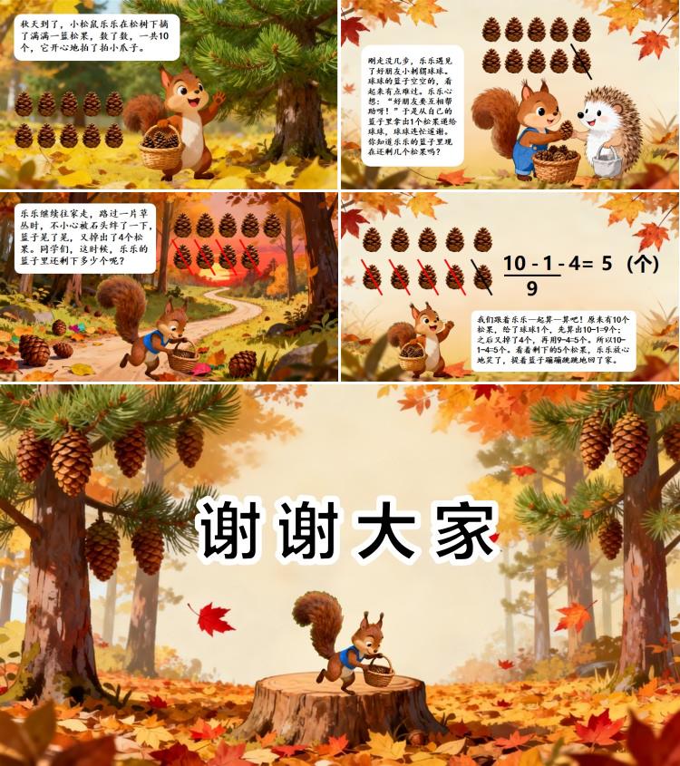 秋天到了,小松鼠乐乐在松树下摘了满满一篮松果,数了数,一共10个,它开心地拍了拍小爪子。