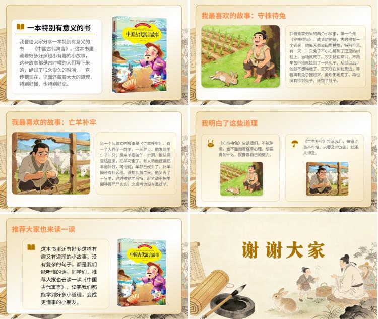 这本书里还有好多这样有趣又有道理的小故事,没有复杂的句子,都是我们能听懂的话。同学们,推荐大家也去读一读《中国古代寓言》,读完我们都能学到好多小道理,变成更懂事的小朋友。